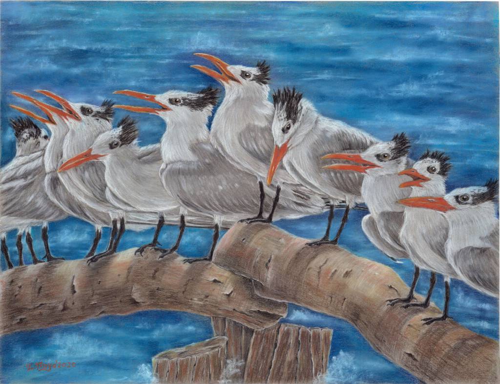 Una alegre bandada de Pagazas Reales se reúne en un pequeño muelle.